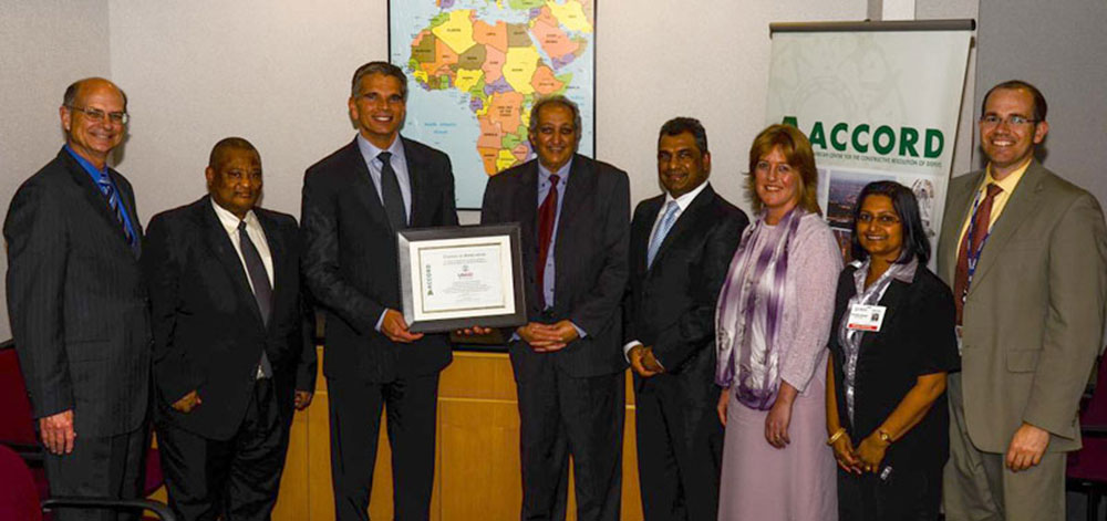 The awarding of the citation is part of ACCORD’s twenty year celebrations that will culminate with the hosting of ACCORD’s Africa Peace Award in the last quarter of 2012. The above ceremony formed part of ACCORD’s United States (US) celebration of its twenty year anniversary, that included a function in Washington hosted by the South African Ambassador to the US, H.E. Ambassador Rasool, and a function held in New York, hosted by the South African Permanent Representative to the United Nations, H.E. Ambassador Sangqu, which brought together individuals that ACCORD has worked with over the last twenty years from USAID, the State Department and the United Nations, among others.